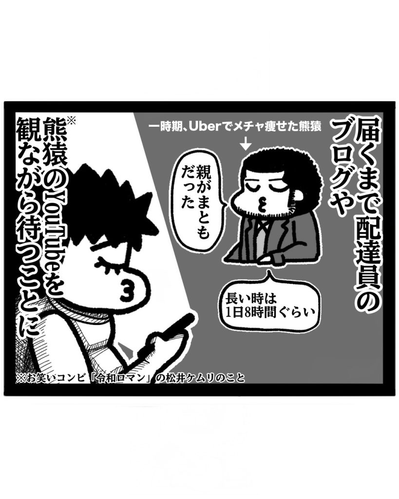 令和ロマンのオフィスシャルチャンネルの過去の動画で熊猿で大活躍した松井ケムリが数年前Uber配達員をしてた頃の話をしてる回をみた。めっちゃ痩せてる!!やはりUberエクササイズは可能性あるな!!